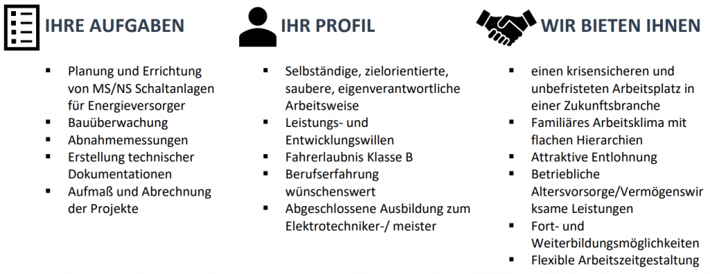 Elektrotechniker-in/ Meister-in (m/w/d) Zu Ihren Aufgaben gehören die Planung und Errichtung von Mittel- und Niederspannungsschaltanlagen für Energieversorger sowie die Bauüberwachung und Durchführung von Abnahmemessungen. Außerdem erstellen Sie technische Dokumentationen und übernehmen das Aufmaß sowie die Abrechnung der Projekte.