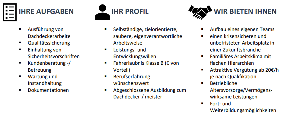 Dachdecker-in/ Meister-in (m/w/d) Sie führen sämtliche Dachdeckerarbeiten eigenständig aus, achten auf die Einhaltung von Sicherheitsvorschriften und sichern die Qualität der ausgeführten Leistungen. Zusätzlich betreuen Sie Kunden, übernehmen Wartungs- und Instandhaltungsaufgaben sowie die technische Dokumentation der Projekteachkundigen und handwerklich geschickten Arbeit erstellen sie Dachlattungen und Unterkonstruktionen, decken Dächer mit unterschiedlichen Naturmaterialien ein und sorgen dafür, dass das Dach nicht nur die Witterung abhält und Wärme speichert, sondern auch zur Optik des Hauses passt.